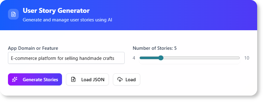 - AI-Powered Story Generation: Simply input a high-level feature idea or epic, and our AI will generate a list of relevant user stories, helping you break down complex functionality into manageable pieces for your backlog.