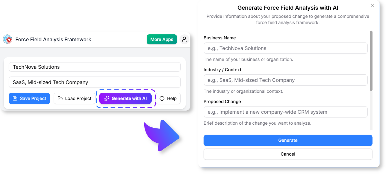 We are excited to launch the new Force Field Analysis Framework app, a powerful and free AI force field analysis tool that guides you through the process of understanding and managing change. This intelligent wizard helps you identify the forces pushing for and resisting change, allowing you to develop effective strategies for successful implementation.