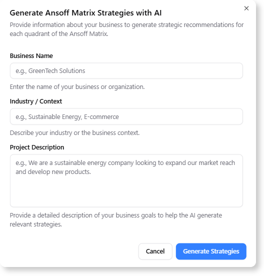 • AI-Powered Strategy Suggestions: Get a creative boost from our AI. Click into any of the four quadrants and let the AI help you brainstorm specific tactics for Market Penetration, Product Development, Market Development, or Diversification.