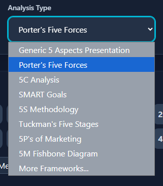 - Instantly Generate Analyses: Simply enter a topic and choose from dozens of strategic frameworks—from SWOT and PESTLE to Mintzberg’s 5 Ps—and let the AI generate a complete, structured analysis for you.