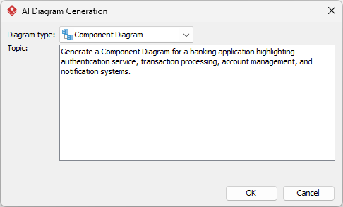 - Enter your topic or prompt in the text field. For example: “Generate a Component Diagram for a banking application highlighting authentication service, transaction processing, account management, and notification systems.”