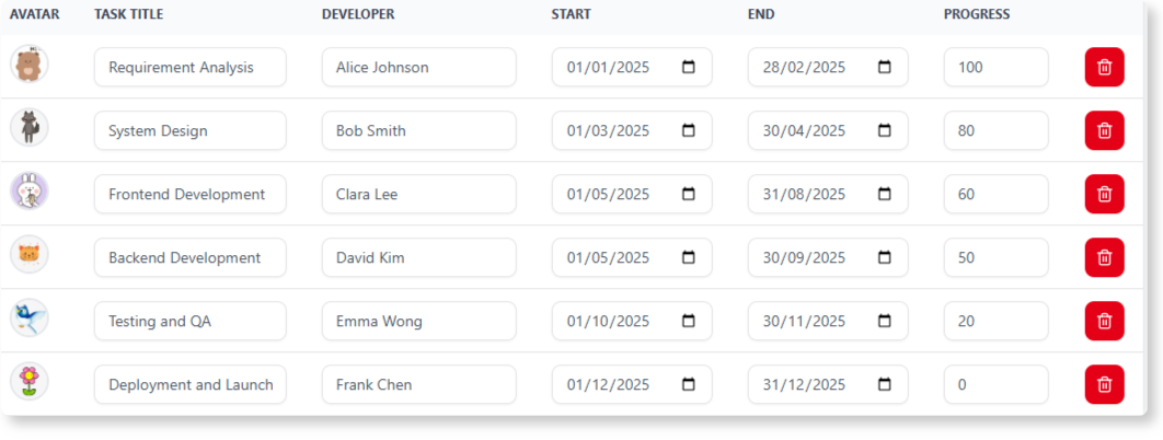 - Build Timelines Visually: Add, edit, and delete tasks using a simple table editor without touching a single line of code.