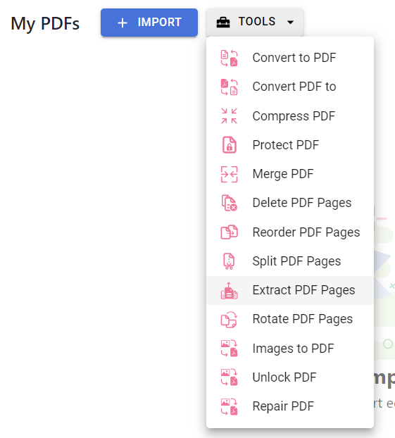 - Press the “TOOLS” button and select “Extract PDF Pages”.