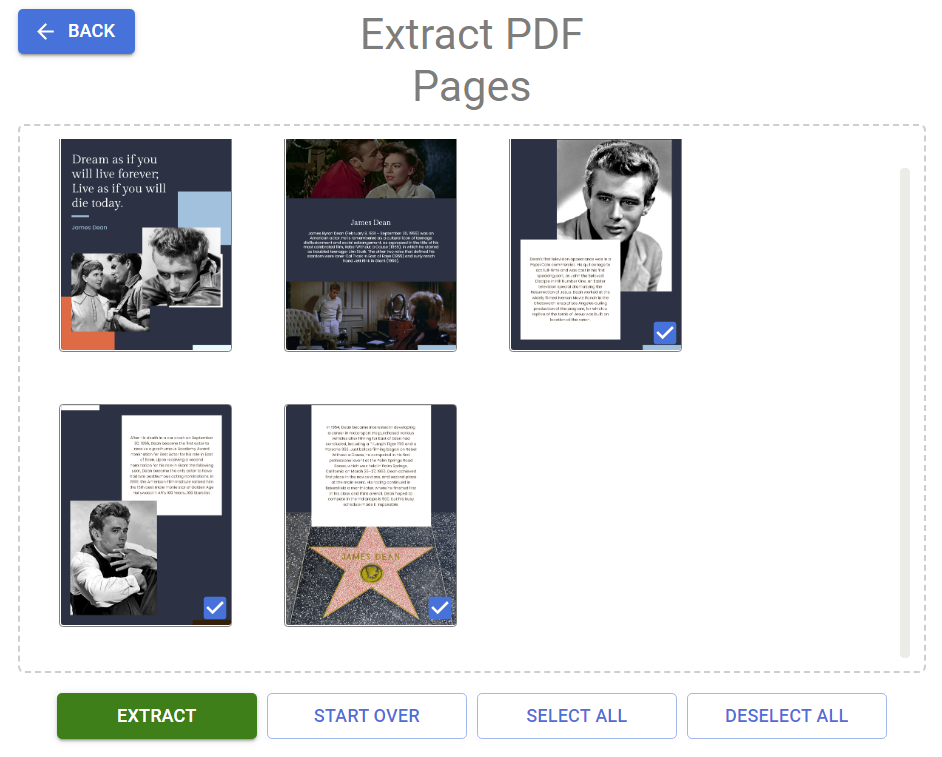 - After upload, the pages in your PDF file are listed, you can click to select the pages you would like to extract. The selected page will have a tick icon, shown at its bottom right corner.