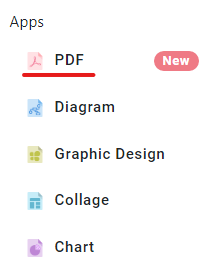 1. After login into your Visual Paradigm Online workspace, Go to Dashboard and select Apps, PDF, to go to your PDFs Workspace