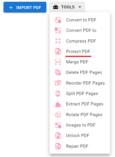 2. Press the “TOOLS” button and select “Protect PDF”.