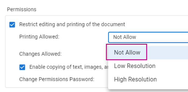 В разделенастройка разрешений,вы можете нажать на«разрешить печать»выпадающее окно и выбрать«Не разрешать».