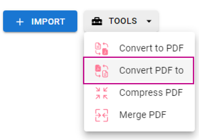 Tìm hiểu “Công cụ” nút trong khu vực làm việc của bạn và chọn “Chuyển đổi PDF thành” để mở bảng chuyển đổi.