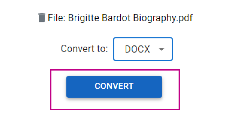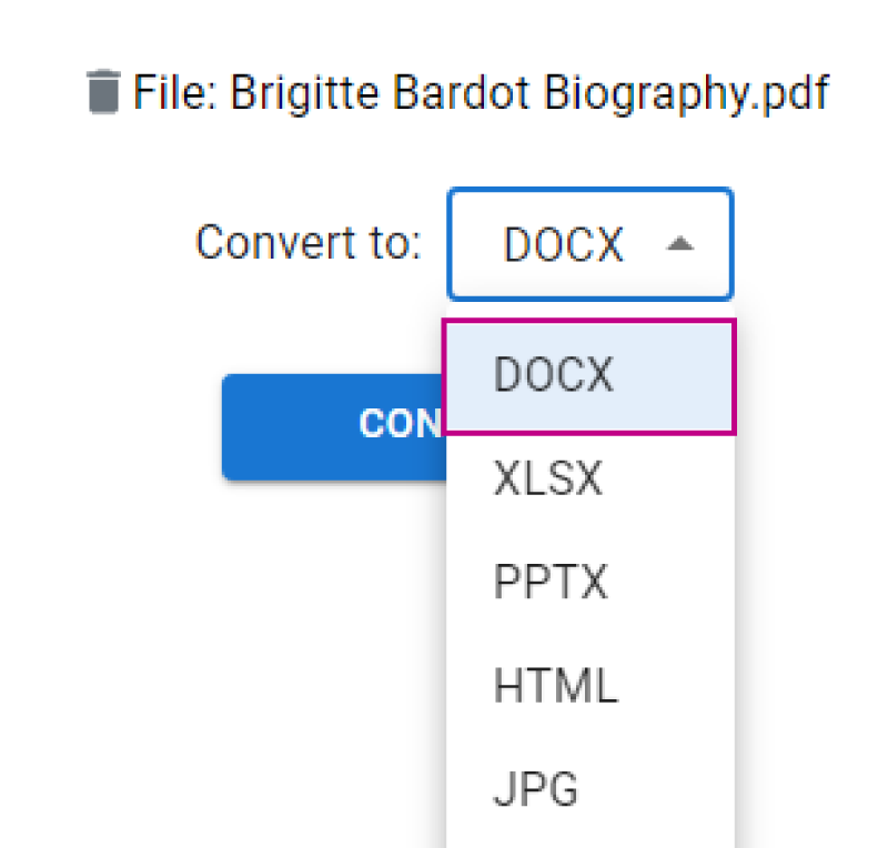 Sau khi tệp của bạn được tải lên như dưới đây, bạn có thể nhấp vào “Chuyển đổi thành:” và chọn “DOCX”để chuyển đổi tệp của bạn sang định dạng Microsoft Word.